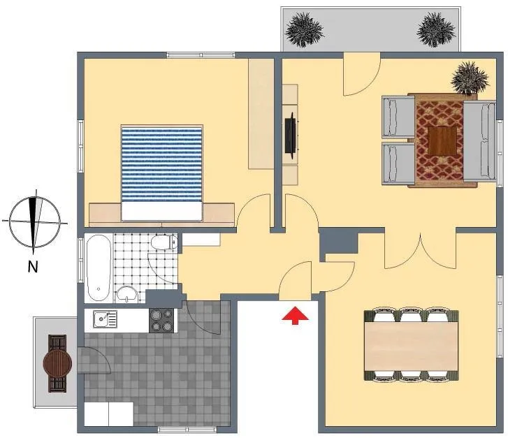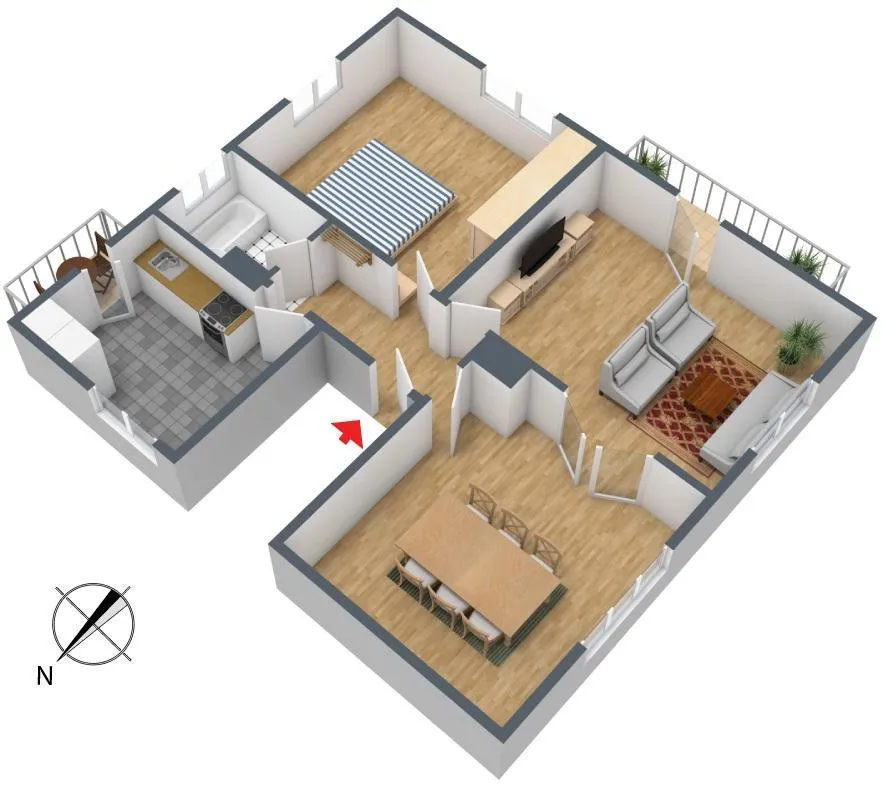 Der Grundriss der Wohnung ist gut. Alle Räume sind vom Flur begehbar. Ein Balkon ist von der Küche begehbar (Küchen-Balkon), ein weiterer Balkon ist vom Wohnzimmer begehbar. Das Badezimmer verfügt über ein Fenster.