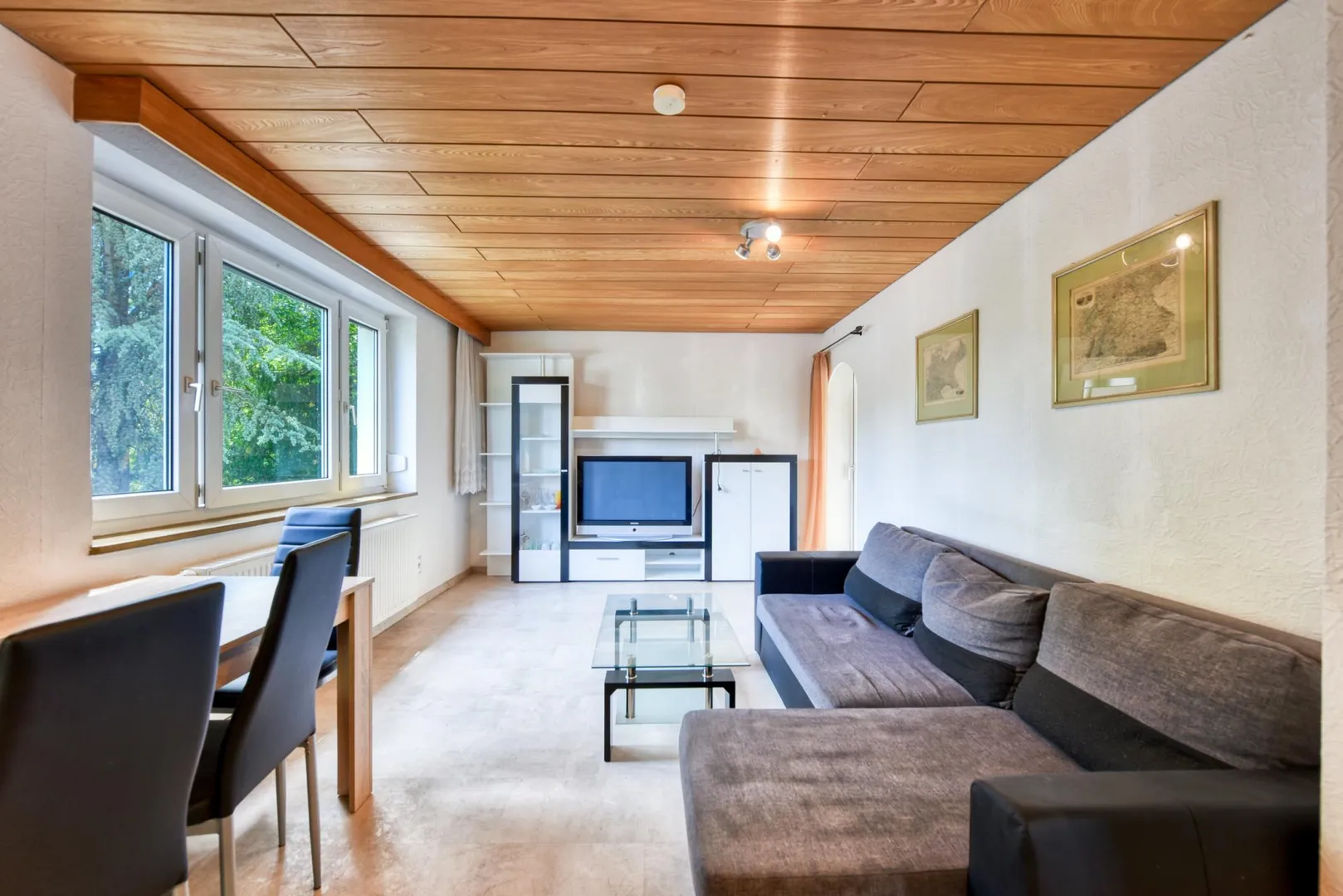 Die Wände sind überwiegend tapeziert. Die Decke im Wohnzimmer ist mit Holz-Paneelen verkleidet. Die Raumhöhe beträgt ca. 2,37 Meter.