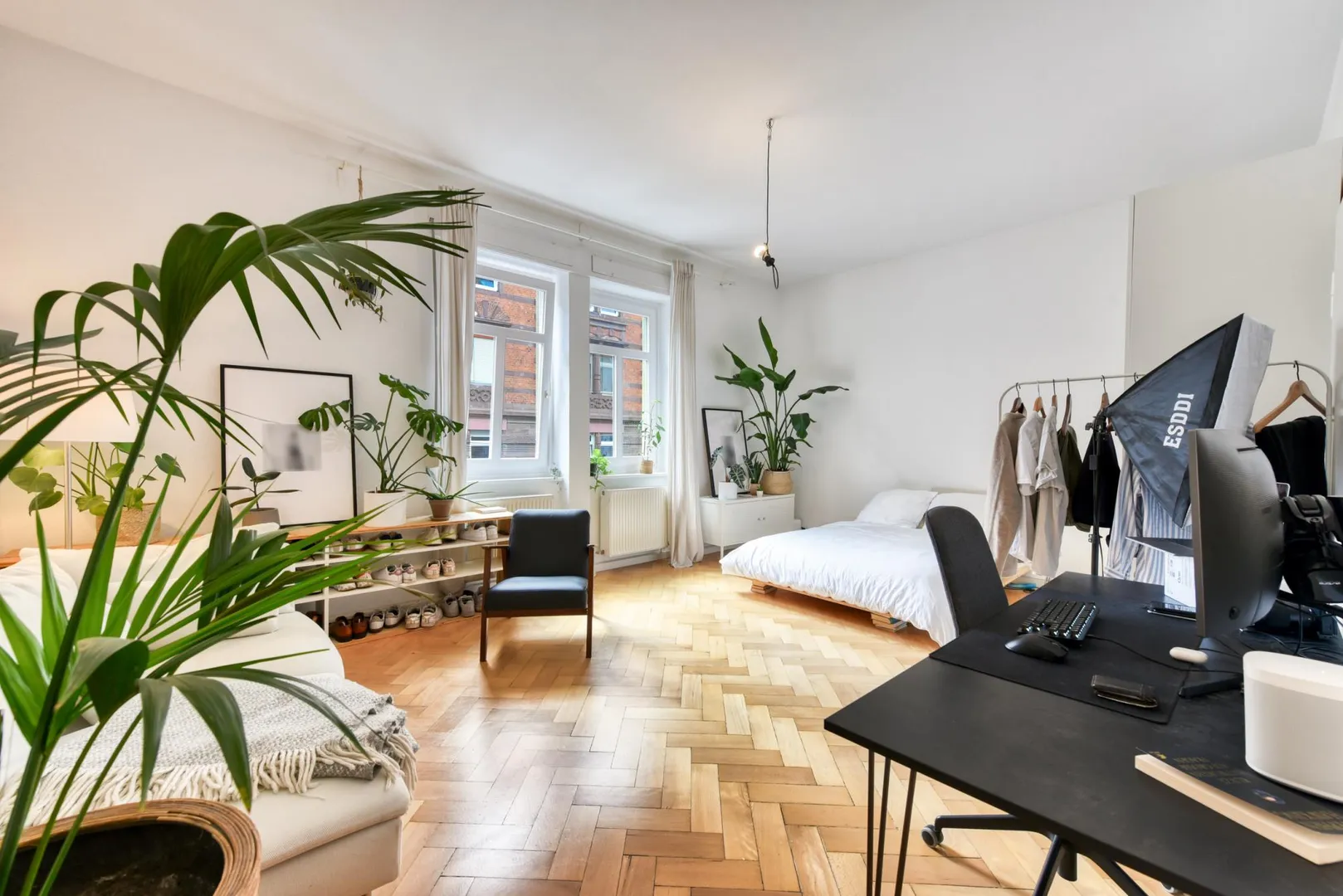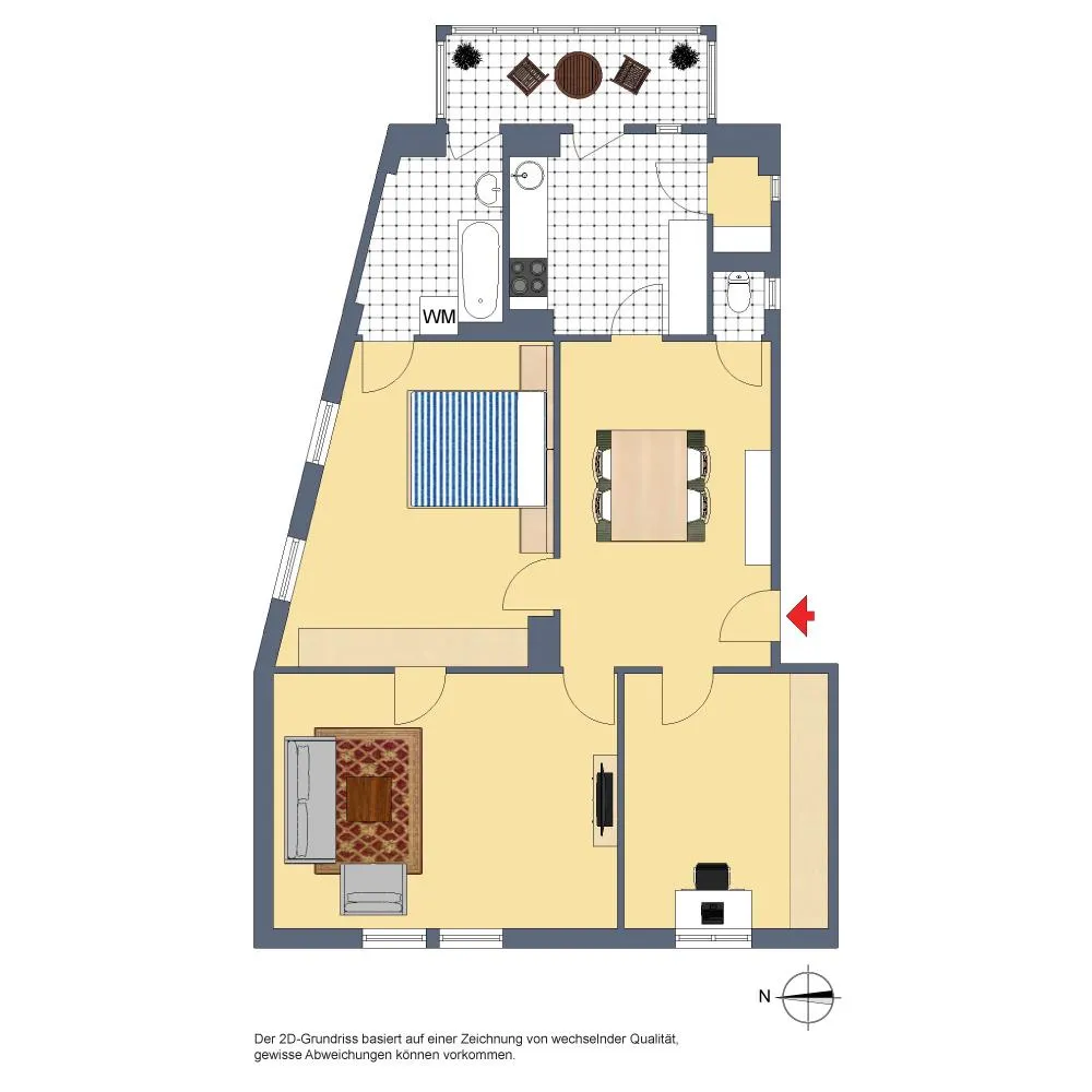 Das Wohnzimmer sowie das Arbeitszimmer sind nach Westen ausgerichtet. Das Badezimmer sowie die Küche, jeweils mit Zugang zur Veranda sowie die Veranda selbst sind nach Osten ausgerichtet. Das Schlafzimmer ist nach Norden ausgerichtet.