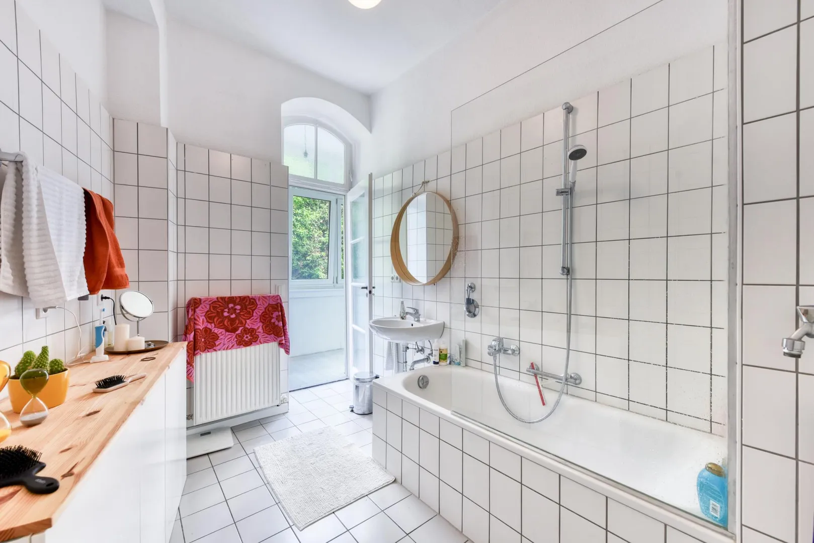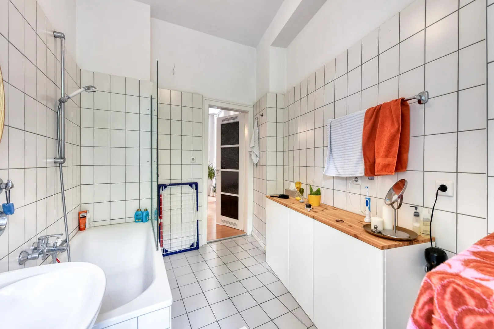 Das 2/3-hoch geflieste Badezimmer ist ausgestattet mit einer Badewanne sowie einem Waschmaschinen-Anschluss.