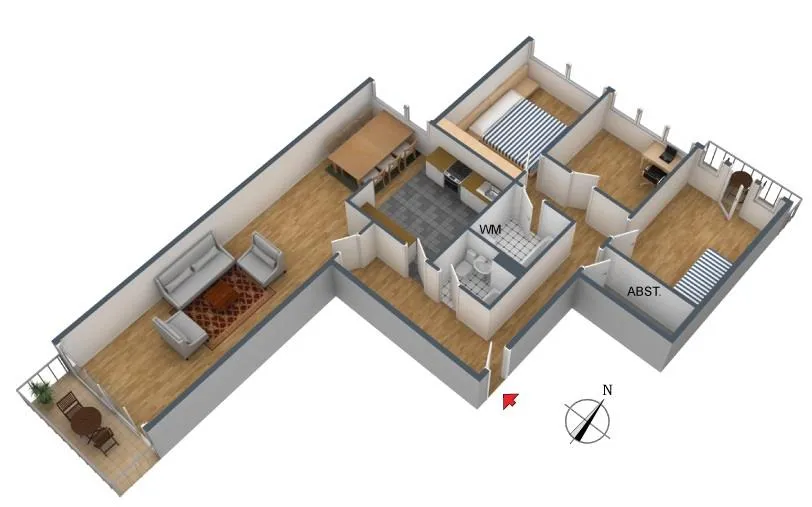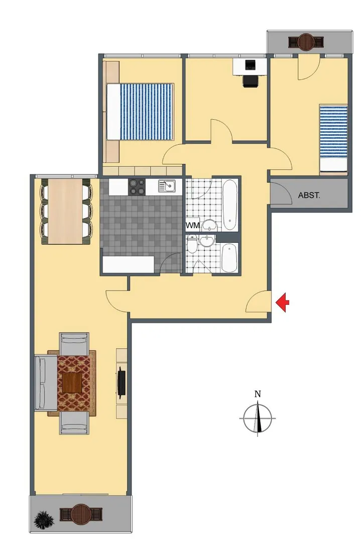 Die Wohnung verfügt über ebenfalls zwei Balkone. Der Süd-Balkon ist über das Wohnzimmer begehbar. Der Nord-Balkon ist über das Kinderzimmer begehbar. Beide Balkone sind überdacht.