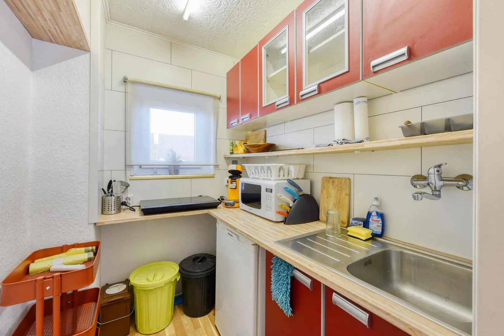 In der Küche ist Laminat verlegt. Die Küche verfügt über einen Kühlschrank mit Gefrierfach, eine Spüle, ein Mikro/Grill-Kombigerät, eine Kochplatte sowie Unter- und Oberschränke.