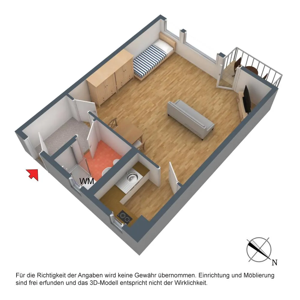 Diese modernisierte, geflegte und voll möblierte 1-Zimmer-Wohnung befindet sich im 2. Obergeschoss (Dachgeschoss ohne Schrägen).